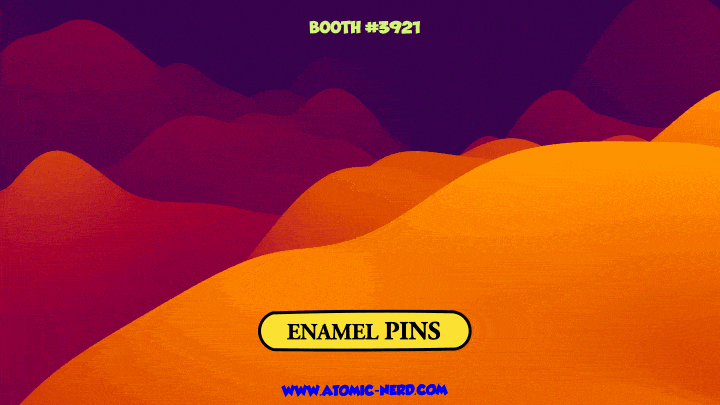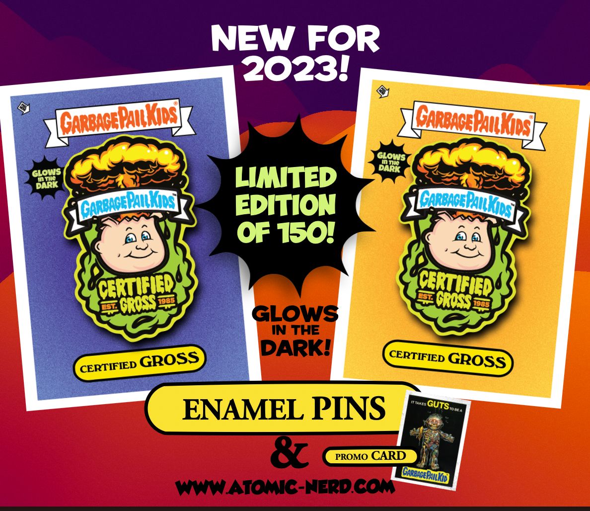 These special limited edition Certified Gross. GLOW IN THE DARK enamel pins licensed exclusively by Topps measure approximately 2” x 2.5” each on their own 4”x 3” backing card. These exclusive pins feature fan favorite, Adam Bomb, in an ALL NEW DESIGN for SDCC 2023! The pins, sold separately, come with an exclusive,  Promo Trading Card officially licensed by Topps! This special pin and promo card is available ONLY from Atomic ToyBox.