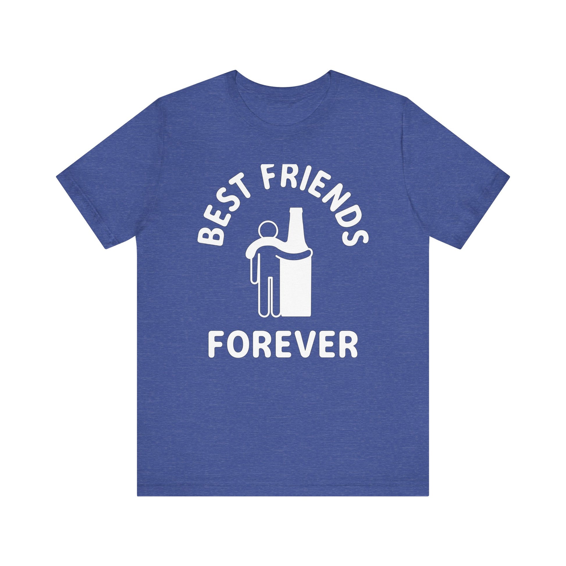 A trendy and fun T-shirt featuring the title 'Best Friends Forever' with a unique design of a person with his arm around a life size beer bottle. The anthropomorphic beer bottle also has an arm around the man, creating a whimsical and playful vibe. Perfect for those who enjoy a good beer and want to show off their friendship with a fun twist. Ideal for casual wear, hanging out with friends, barbecues, and parties.