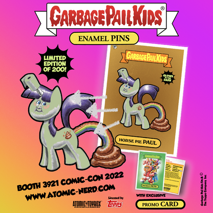 This special limited edition glow in the dark enamel pin licensed exclusively by Topps measures approximately 2” x 2.5” on a 4”x 3” backing card. This exclusive pin features fan favorite, Horse Pie Paul. The pin comes with an exclusive, officially licensed Promo Trading Card officially licensed by Topps! This special pin and promo card is available ONLY from Atomic Toybox.
