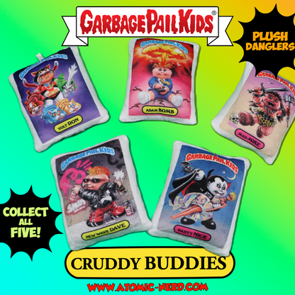 Introducing Atomic's exclusive new line of Cruddy Buddies Novelty Plush Pals, featuring the iconic Garbage Pail Kids! These unique plush collectibles measure approximately 3" x 5" and come complete with a handy chain for easy attachment to your bag or backpack.