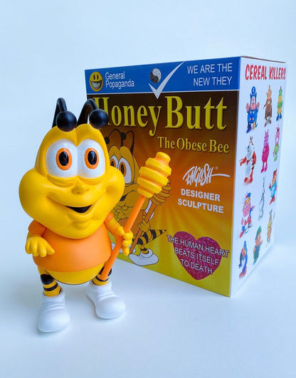 The latest addition to Ron English’s Cereal Killer series is Honey Butt the Obese Bee! Standing 8” tall and wielding his dipper, Honey Butt is a buzz to the gut!