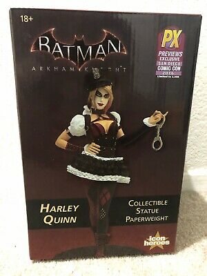 You just can't keep a good villain down . . . but a good villain can keep your papers down, and so Icon Heroes is proud to announce the SDCC Exclusive Batman: Arkham Knight Harley Quinn statue paperweight! Made of high quality polystone resin and expertly painted, this 8" statue paperweight is ready to take over your desk, just like she plans to take over Gotham! This Arkham City Harley Quinn paperweight statue will be unveiled at the 2016 San Diego Comic-Con and is limited to 2500 pieces.